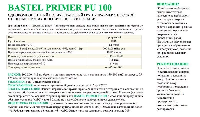 Однокомпонентная быстросохнющая полиуретановая грунтовка BASTEL, предназначена для подготовки гигроскопичных и негигроскопичных оснований перед нанесением двухкомпонентного полиуретанового клея BASTEL EKO KLEBER-2K.
